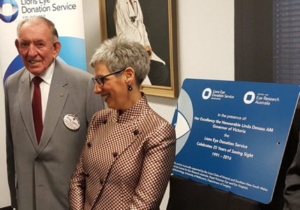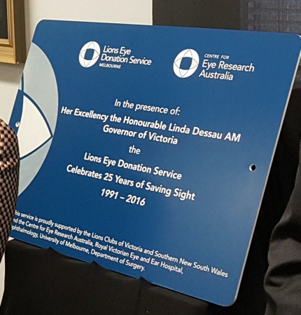 Her Excellency the Honourable Linda Dessau AM, Governor of Victoria unveils a plaque commemorating 25 years of the Lions Eye Donation Service from 1991 to 2016.